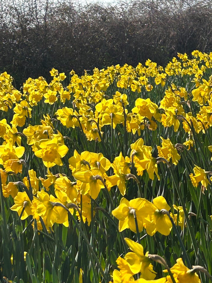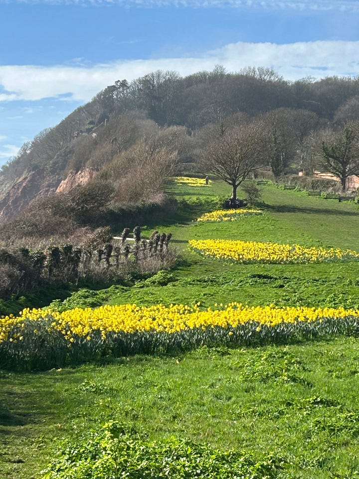 Hello friends, and welcome to this week’s post. There has been a definite change in the weather, mostly it’s not raining constantly, but there has been a bit of sunshine too. Not much, it has to be said, but enough to raise the spirits a little. And goodness they need raising. No politics on here, but blimey, it all feels like a horrible mess. All the more reason for finding the joy in the weather, in the seasons, in the flora and fauna of all and every kind, the changing light levels and the increasing warmth in the sun (when it shows itself). And reading and books, and eating something other than winter-warming casseroles, and looking in the wardrobe every morning and wondering if this jumper is too heavy now, or could I leave off a layer? An ordinary life, and I thank heaven for it. This may be a small and over-crowded island but my part of it is lush and green (all that rain), or soon will be. The blackthorn in the hedgerows has bright green new leaves appearing, mosses are vibrant, the smell of wild garlic is pungent under the trees and the strappy leaves of bluebells are clumping up. The daffodils on Peak Hill are at their golden best. In the garden the roses have new shoots, primroses are shining out—they’ve self-seeded in the lawn and I love it—and the little blue pyramids of muscari are everywhere. Tulips are just showing in the pots on the front step, and this week I shall deadhead the hydrangeas ready for this year’s flowers. The garden birds are calling in the mornings and huge queen bumblebees are bumbling around the windows. It will soon be all go in the garden. There is a tiny blot on this landscape—The Shed. It’s a horrendous mess of a place for everything (quite literally) and nothing in its place. We know it has to be cleared out and organised for the new season, but oh, it’s the worst job. The cobwebs, the massive spiders, ugh. I can’t bear to think about it. Pretty much the same applies to The Greenhouse. In the winter it takes on the guise of temporary storeroom when we can’t be bothered to go as far as the shed, and has the same issues—cobwebs and spiders, dead flies, etc. Last week in the search for some gardening gloves I picked up a pair off the staging and a huge garden spider dropped out. The screams could be heard in Exeter. A had to come and investigate each finger before I would put them on, and he’s not very keen on them either—spiders, that is, not gardening gloves. This weekend we will be poring over catalogues for summer bulbs and thinking about new perennials. It definitely lifts the spirits and I’d rather be oiling the wheelbarrow than thinking the world is going to hell in a handcart.